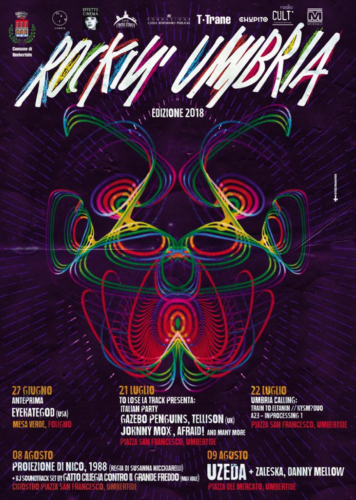 Vero e proprio punto di riferimento per tutti gli appassionati di musica e sottoculture giovanili in Umbria negli anni ’80 e ‘90, Rockin’ Umbria continua a percorrere il nuovo cammino intrapreso nelle ultime edizioni. Con il patrocinio e il supporto del Comune di Umbertide, in collaborazione con l’associazione culturale St.Art, l’etichetta indipendente To Lose La Track e l’associazione Effetto Cinema, nel 2018 il festival ritorna sperimentando una formula articolata tra luglio e agosto: il 21 e 22 luglio nella location di piazza San Francesco, con alcuni appuntamenti nel chiostro adiacente e nella vicina chiesa di Santa Croce, l’8 agosto nel chiostro di piazza San Francesco e il 9 agosto in piazza del Mercato, ai piedi della storica cornice della Rocca. Tutti gli eventi, a eccezione della serata di mercoledì 8 agosto, saranno a ingresso gratuito. Mercoledì 27 giugno l’anteprima (ore 21.30, 16 euro), eccezionalmente ospitata dal Mesa Verde, spazio estivo del Serendipity di Foligno: direttamente da New Orleans, approderanno a Rockin’ Umbria gli Eyehategod, con il tour celebrativo dei trent’anni di attività. Dai Black Sabbath ai Melvins, dai Black Flag allo stoner, la band sludge-metal si è saputa conquistare negli anni uno zoccolo duro di fan a colpi di tour in tutto il mondo e dischi senza compromessi. In apertura, Discomfort e Methylhate. Il festival si apre sabato 21 luglio con l’Italian Party, consolidando l’amicizia di Rockin’ Umbria con l’etichetta indipendente umbertidese To Lose La Track. Diventata “maggiorenne”, la storica festa dell’etichetta ospita quest’anno diciannove band provenienti da ogni parte d’Italia e Regno Unito, che si alterneranno sui due palchi del festival (piazza e chiostro): Tellison (Uk), Labradors, Futbolín, Chambers, Suvari, Dags!, Olympians (Uk), Johnny Mox, Tunonna, I Like Allie, Girless, Montana, Kint, Cayman The Animal, Gazebo Penguins, Afraid!, Hexn, Mush, Dead Poets Society. Saranno presenti anche stand e banchetti dedicati alle autoproduzioni di vinili, magliette, cd, fumetti. Domenica 22 luglio ritorna ‘Umbria Calling’, storico format di Rockin’ Umbria da sempre dedicato alla musica indipendente umbra nelle sue manifestazioni più interessanti: per l’edizione 2018, il festival ha scelto di rinnovare il format proponendo delle performance non convenzionali, che entrano in dialogo con lo spazio di piazza San Francesco e del chiostro. A coronamento di una residenza d’artista a Umbertide, il collettivo A23 (Nicola Frattegiani, Alessandro Fiordelmondo, Nicola Cappelletti) presenterà la performance site-specific ‘InProcessing 1’, in cui la musica elettroacustica entra in rapporto con le strutture architettoniche, i materiali e i vuoti del chiostro, nella creazione di un design sonoro unico. Performance estemporanea e perciò irripetibile sarà quella proposta dal duo Hysm?, che si articolerà tra nuove composizioni e momenti di improvvisazione pura. Entrambe le esibizioni saranno incorniciate dal sound di Train to Eltanin, dj e producer originario di Umbertide ma di stanza a Milano. Il cartellone si snoda fino ad agosto con due appuntamenti: mercoledì 8 agosto (ore 21.00, ingresso intero 10 euro, ridotto 8) la programmazione del cinema all’aperto si conclude con ‘Nico 1988’, di Susanna Nicchiarelli (chiostro di piazza San Francesco): dedicato agli ultimi anni della leggendaria artista tedesca, il film vuole andare al di là dell’immagine di musa di Andy Warhol e dei Velvet Underground, mostrando una fase cruciale della vita e della carriera di Christa Paffgen (in arte Nico). La proiezione sarà arricchita da un minimal VJ soundtrack set eseguito da Max Viale dei Gatto ciliegia contro il grande freddo, che ha curato anche la colonna sonora del film. Giovedì 9 agosto Rockin’ Umbria riabbraccia uno dei gruppi italiani più accreditati e amati all’estero, che nel 2018 festeggia i 30 anni di attività: riscoprendo la storica location della Rocca (piazza del Mercato), il festival ospiterà gli Uzeda, dopo la prima partecipazione a Rockin’ Umbria nel 1992. Unico gruppo italiano insieme alla PFM ad aver registrato le ‘Peel sessions’ del leggendario dj radiofonico della BBC John Peel, sin dal 1994 collaborano con l’etichetta americana Touch&Go e con il produttore Steve Albini. L’attività degli Uzeda conta oltre 1.200 concerti in Europa e negli Stati Uniti e, al momento, è concentrata anche sulla rifinitura dei brani che compariranno nel nuovo disco, già inseriti in scaletta nei concerti del 2018. L’apertura è affidata a Zaleska, progetto in solo di Caterina Palazzi, leader e contrabbassista dei Sudoku Killer: nella performance per contrabbasso e loop, ogni composizione è ispirata a un attore che ha impersonato il personaggio di Dracula nella storia del cinema. Inizio serata all’insegna della musica umbra con i Danny Mellow, quartetto strumentale folignate di ispirazione kraut-pysch.