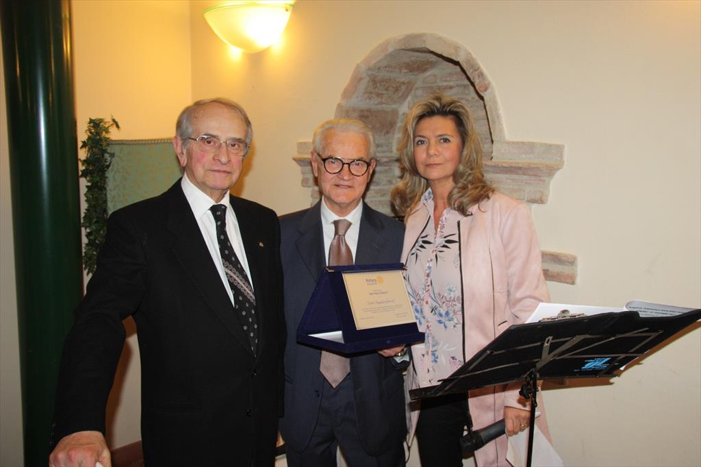 Serata degli Auguri per il Rotary club Gubbio ieri con musica, riconoscimenti e solidarieta' in primo piano: a portare il saluto del sodalizio il presidente Piero Lucio Capitoli, affiancato dall'assessore comunale Nello Fiorucci. Nel corso della serata, allietata dalla musica di Fausto Paffi che ha accompagnato il tenore Giovanni Ciao e il soprano Giulia Ciao, è stata premiata la Bottega storica rappresentata dallo studio Fotografico di Gianfranco Gavirati. Tra le iniziative di solidarietà la donazione di un assegno di 3.000 euro raccolti in occasione della giornata di sport e partecipazione "Run for you": a ricevere l'offerta i responsabili dell'aratorio familiare, Luca Tittarelli e Silvia Baldelli. Sono state anche lette alcune poesie di Anna Buoninsegni, che ha ricevuto il premio "Onorano Gubbio" ma la consegna brevi manu avverrà in una prossima occasione, causa assenza giustificata della scrittrice e poetessa eugubina.