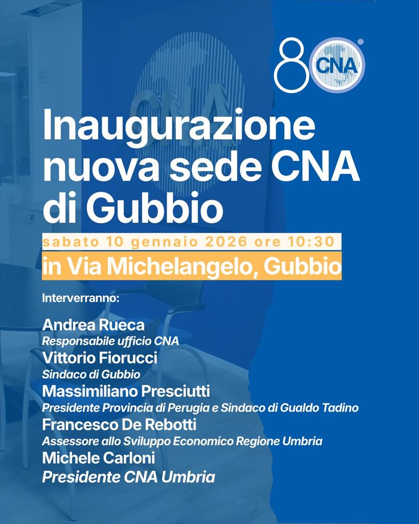 E' fissata per Sabato 10 gennaio l'inaugurazione della nuova sede territoriale CNA di Gubbio alle ore 10.30 in via Michelangelo. Un evento che rappresenta non solo un monento di crescita organizzativa per CNA, ma anche il rinnovato impegno verso imprese, territorio e comunità eugubina. Un momento simbolico che avviene nell’anno in viene celebrato l’ottantesimo anniversario dalla nascita di CNA Umbria.