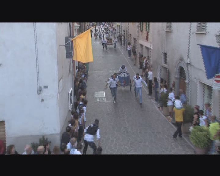 Si è conclusa ieri intorno alle 19 la 26esima Corsa delle Bighe, la rievocazioni delle origini romane del comune di Scheggia, festa nata nel 1991 dall'idea di un gruppo di ragazzi capitanati dalla figura celebre per il piccolo comune umbro di Arcangelo Torcolini, appassionante giornata folcloristica che si ripete ogni 8 settembre giorno della festa nell'ambito del calendario cristiano-diocesano della nascita dell'Immacolata. Per le vie di Scheggia dunque è tornata ad animarsi l'appassionante sfida tra i due rioni, in cui si divde per un giorno la città, il Rione Borgo, simboleggiato dall'Aquila e il Rione Piazza simboleggiato dal Cavallo. La giornata si è aperta all'alba quando il suono delle tamburine ha svegliato i Capo Rioni, Antonio Brugnoni per il Borgo, e Alberto Arcangeletti per la Piazza, successivamente la toccante visita al civico cimitero, poi il ritorno in città con la colazione degli auriga, riconoscibili dalla divisa, composta da pantaloni blu, fusciacca blu, camicia o maglia bianca con un fazzolettone che varia a seconda del rione di appartenza, blu per il Borgo Giallo per la Piazza. Dopo la colazione, la messa celebrata da Don Luigi Lupini poi l'esibizione delle tamburine, ha proceduto la sfilata degli aurighi con la quale si è chiusa la mattinata. Nel pomeriggio intorno alle 16 è partita la processione per le vie della città, una volta terminata ha preso invece il via il corteo di epoca romana che ha sfilato lungo quello che sarebbe stato il percorso della gara. Alle 18,30 il via alla prima manche della corsa con le Bighe che hanno attraversato a velocità folle Via Roma, Via Sentino, il tratto dell'arceviese, Via del Campanile e infine Via Masaccio prima dell'arrivo in Piazza Luceoli dove il cronometro si è fermato ed ha visto il borgo vincere per questione di centesimi di secondo. Giusto il tempo di risistemarsi lungo il percorso e via alla seconda manche con le bighe che sono state lanciate ancora in una folle corsa che ha visto questa volta prevalere sempre per una questione di pochissimi centesimi la Piazza. Al termine della seconda manche, la somma dei tempi che ha incoronato per appena 5 centesimi di differenza il Borgo vincitore, non senza qualche polemica, per la ventesima sulle 26 edizioni totali. Alle 19 la cerimonia di premiazione presieduta dal sindaco Fabio Vergari, il quale ha voluto omaggiare per il grande lavro svolto nell'organizzazione dell'evento, il neocostituito Ente Corsa delle Bighe, oltre che alla Pro Loco di Scheggia e ai Capo Rioni dell'anno corrente. La festa è continuata poi per le vie del Centr Storico, tra canti e balli fino a tarda nottata, con lo spettacolo pirotecnico che ha chiuso l'edizione 2016.