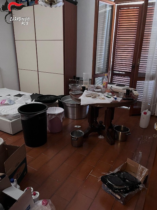 Una vera e propria raffineria di cocaina, consistente in un laboratorio artigianale e clandestino per la trasformazione della pasta di coca grezza in cocaina cloridrato, è stata scoperta in una villa di Foligno dai carabinieri, che hanno arrestato tre persone. Il rinvenimento di una raffineria di questo genere per l'estrazione e la lavorazione della pasta di cocaina rappresenta un unicum per l'Umbria ed un evento raro anche in campo nazionale, sottolinea l'Arma. I fatti - resi noti oggi - sono avvenuti il 22 aprile scorso. Il Ros, con la collaborazione del comando provinciale carabinieri di Perugia e della compagnia di Foligno, a seguito di perquisizione personale e locale eseguita d'iniziativa all'interno della villa, ha arrestato per i reati di produzione, raffinazione e detenzione ai fini di spaccio di stupefacenti, un uomo e una donna romeni di 27 e 47 anni, e un colombiano 44enne. L'operazione ha consentito di scoprire il laboratorio all'interno di una stanza dell'abitazione dove sono sati trovati circa 7,4 chilogrammi di cocaina (fra quella già lavorata e quella ancora in pasta grezza), varie tipologie di solventi chimici e attrezzature utilizzate per la raffinazione della droga, una pressa idraulica per la realizzazione dei panetti da 1 chilo con impresso il logo B, e alcuni grossi recipienti in plastica contenenti una miscela di solvente e cocaina ancora in soluzione. Oltre allo stupefacente e al materiale utilizzato per la sua lavorazione, sono stati sequestrati i cellulari degli arrestati e varia altra documentazione ritenuta utile alle indagini, fra cui due manoscritti, in spagnolo e in italiano, contenenti le procedure dettagliate per l'estrazione e la lavorazione della cocaina in pasta. Nel momento dell'ingresso in casa dei militari, la donna - secondo quanto riferito dagli stessi carabinieri - ha opposto resistenza, puntando contro di loro una pistola, poi rivelatasi a salve e senza tappo rosso. La stessa è stata immobilizzata senza conseguenze per nessuno dei presenti. Gli arrestati sono stati accompagnati nelle carceri di Spoleto e Perugia Capanne. Coordina le indagini la Procura della Repubblica di Spoleto.