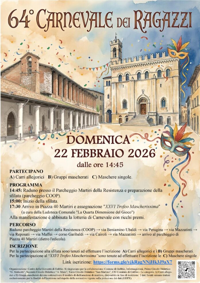 Il Centro della Gioventù di Gubbio organizza per domenica 22 febbraio il 64° Carnevale dei Ragazzi. Partecipano carri allegorici, gruppi mascherati, maschere singole, bande e complessi musicali. Alle ore 14.45 raduno presso il parcheggio Martiri della Resistenza e preparazione della sfilata (parcheggio COOP); ore 15 inizio della sfilata per le vie e piazze del centro storico; ore 17.30 arrivo in Piazza 40 Martiri e assegnazione del "XXVI Trofeo Mascherissima" a cura della Ludoteca Comunale "La Quarta Dimensione del Gioco". Alla manifestazione è abbinata la lotteria di Carnevale con ricchi premi.