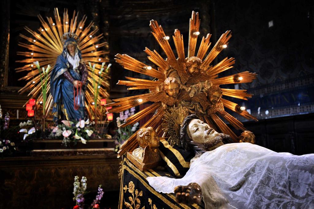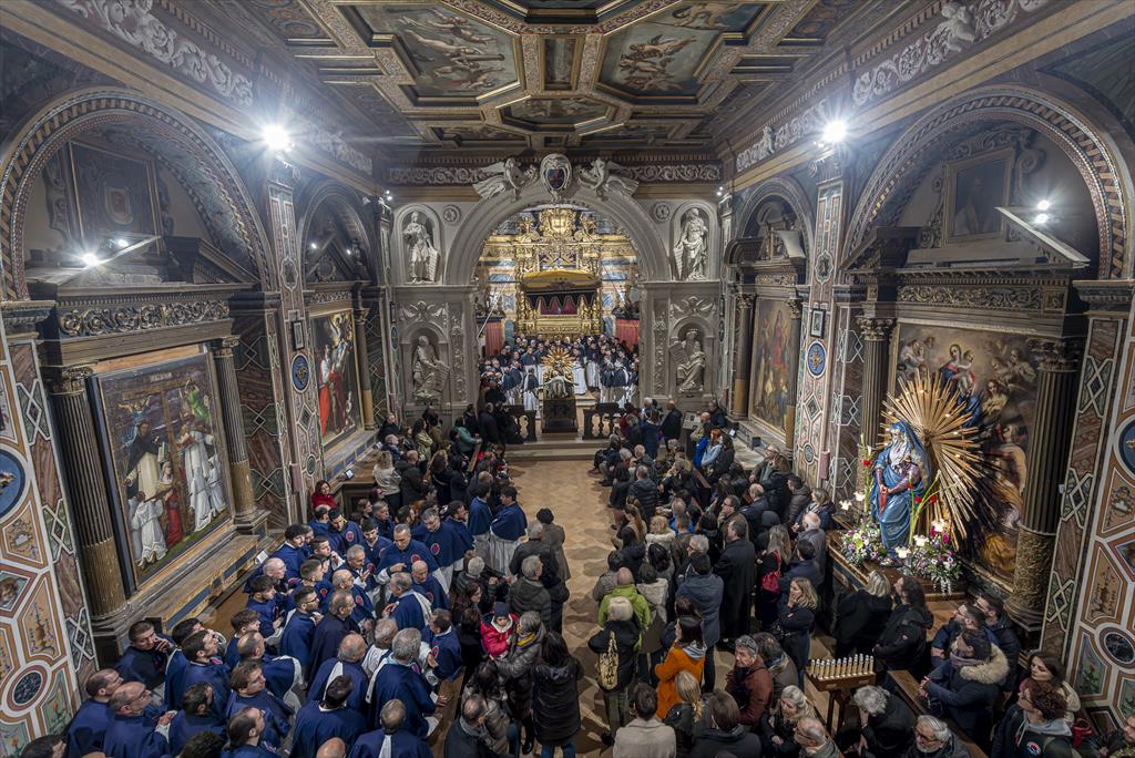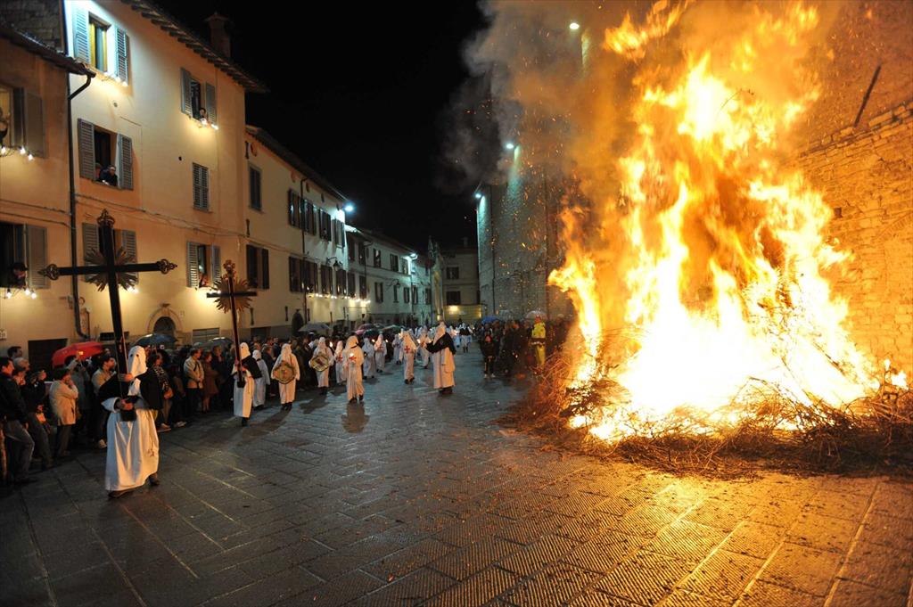 All’imbrunire del Venerdì Santo si rinnoverà a Gubbio la sacra rappresentazione della Processione del Cristo Morto che da secoli è riferimento religioso e culturale di tutto il popolo eugubino. La Sacra Liturgia muoverà alle ore 19.30 dalla Chiesa di Santa Croce della Foce dirigendosi verso il “pietrone” per poi compiere il solito ed antico itinerario che permetteva di mostrare il Cristo Morto alla venerazione di Monasteri, Conventi, Confraternite, luoghi di sofferenza e fedeli: uniche soste al “pietrone” ed alla casa di riposo “Toschi Mosca”. Lo struggente “Miserere”, alternato ai “Canti della Passione”, accompagnerà i simulacri e tutti i simboli della Passione per le vie della città in un clima di silente devozione fino al rientro nella Chiesa di Santa Croce dove i cori si alterneranno nel canto finale. La sacra immagine di Gesù Crocifisso sarà deposta dalla croce nella serata di Mercoledì Santo alle ore 21.15. Alle ore 17 del Venerdì Santo le donne di Cantiano, rinnovando l’antico gesto, compiranno il rito della “Unzione delle Sante Piaghe di Gesù”. Tradizione particolarmente sentita è l’“Ostensione del Cristo Morto” con l’offerta di fiori: le sacre immagini di Gesù Crocifisso e della Vergine Addolorata potranno essere venerate nelle giornate del Venerdì e del Sabato Santo nella Chiesa di S.Croce già dalle ore 7 della mattina. Durante tutta la mattinata del Sabato Santo, sempre nella chiesa di Santa Croce, saranno presenti i sarcerdoti per le confessioni. Alle ore 21.15 del Sabato Santo i confratelli compiranno il gesto della “Reposizione di Gesù Crocifisso” nella nicchia dell’altare maggiore.
