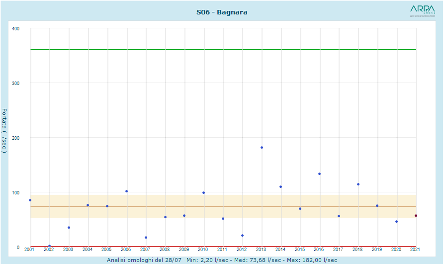 Nel dettaglio ( vedi grafici in "galleria"), guardando ai grafici e considerando che la striscia arancione rappresenta la media di portata, il pallino rosso lo stato al 28 luglio 2021 e quelli blu lo stato nello stesso giorno nei 20 anni precendenti, si nota che Scirca ( nella foto, rifornisce una larga parte del perugino e dell'eugubino ) è pesantemente sotto la sua media storica di 209 l/ s attestandosi al 28 di luglio a 91, secondo peggior dato negli ultimi 20 anni, fece peggio solo nel 2007. Vaccara, che rifonisce il gualdese, da una portata media di 115 l/s è attualmente scesa a 56, terza peggior perfomance negli ultimi 20 anni. Le altre nel 2007 e 2009. Rumore nel gualdese, con portate minori rispetto alle altre, dai suoi 25 l/s di media è attualmente a 15, Bagnara da 106 di media è scesa a 58.