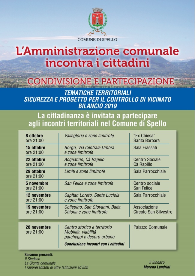 Otto incontri pubblici dedicati alla cittadinanza per informare e condividere tematiche territoriali, la sicurezza con il progetto del controllo di vicinato e il Bilancio 2019. Partirà lunedì 8 ottobre alle ore 21 nell’ex Chiesa di Santa Barbara il ciclo di appuntamenti previsti dall’Amministrazione comunale che, in un’ottica di costante coinvolgimento e trasparenza dei programmi amministrativi, si propone come opportunità di confronto e di scambio reciproco. Ogni zona del territorio, oltre alle questioni d’interesse più generale, avrà la possibilità di approfondire gli aspetti prettamente locali e effettuare segnalazioni. Insieme al Sindaco Moreno Landrini, alla Giunta Municipale e al Comandante della Polizia Municipale di Spello Giancarlo Meniconi, in alcuni appuntamenti e in base ai temi territoriali affrontati, saranno presenti i rappresentanti di altri enti e istituzioni che collaborano con il Comune per fornire ai cittadini le informazioni necessarie. “I diversi incontri pubblici permetteranno di condividere con i cittadini sia questioni d’interesse comune che tematiche più strettamente locali – afferma il sindaco Moreno Landrini -; in continuità con le iniziative finora intraprese dall’Amministrazione volte alla condivisione e partecipazione, riteniamo che questi momenti di incontro siano fondamentali per poi elaborare e progetti e azioni sempre più rispondenti alle esigenze dei cittadini e dei territori”. Gli appuntamenti, che si svolgeranno tutti alle ore 21 sono i seguenti: 15 ottobre Sala Frassati, 22 ottobre Centro Sociale Cà Rapillo, 29 ottobre Sala parrocchiale Limiti, 5 novembre Centro sociale San Felice, 12 novembre Sala parrocchiale di Capitan Loreto, 19 novembre sede dell’Associazione Circolo San Silvestro. Il ciclo di appuntamenti terminerà il 26 novembre nel Palazzo Comunale con un incontro conclusivo dedicato ai temi del centro storico e viabilità, mobilità, viabilità parcheggi e decoro urbano.
