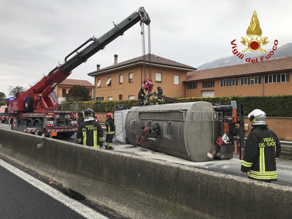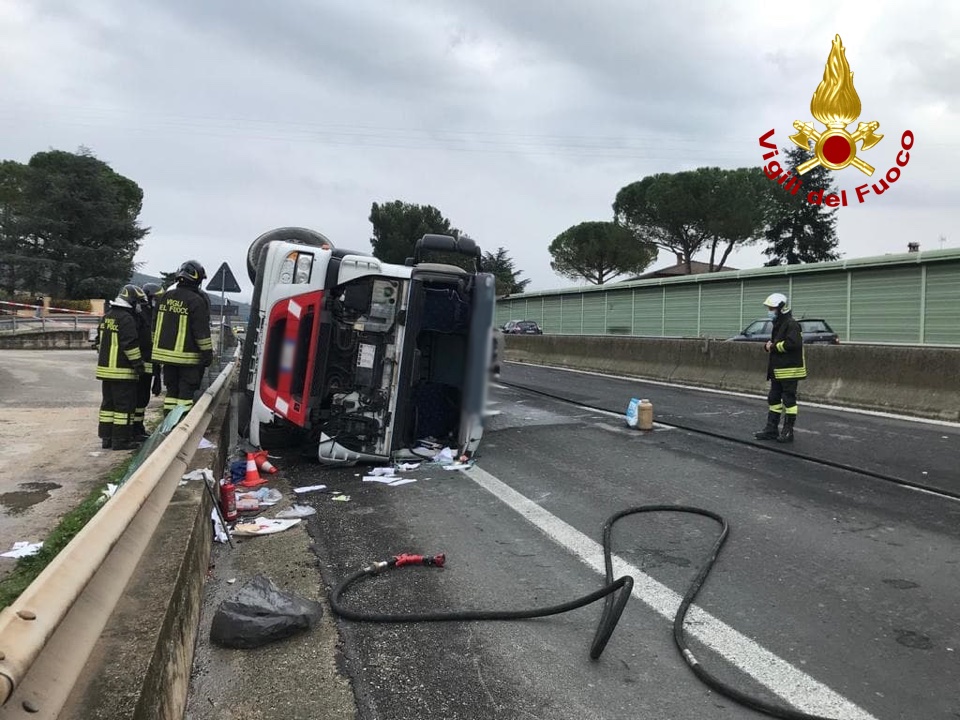 A Spello dopo ore di lavoro si è concluso nel pomeriggio l’intervento dei Vigili del fuoco sulla superstrada E45 per un'autocisterna di gasolio ribaltata: soccorso il conducente, il nucleo NBCR (Nucleare Biologico Chimico Radiologico) ha prima offerto assistenza alle operazioni di travaso, poi le squadre hanno rimosso il mezzo con l’autogrù. La strada è rimasta chiusa dalle 10 e riaperta alle 16.10. Durante le operazioni più delicate del travaso, sono state chiuse entrambe le direzioni di marcia.