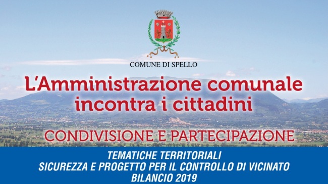 Si concluderanno lunedì 26 novembre con un incontro nella Sala dell’Editto alle ore 21, gli appuntamenti promossi dall’Amministrazione comunale per informare e condividere con i cittadini progetti, tematiche territoriali e bilancio 2019. I sette appuntamenti, che si sono svolti a partire dal mese di ottobre nelle diverse zone del territorio comunale, sono stati un’importate occasione di confronto per affrontare questioni d’interesse più generale, ma anche per approfondire aspetti prettamente locali e raccogliere idee e segnalazioni. Nell’incontro conclusivo di lunedì interverranno il Sindaco Moreno Landrini, la Giunta Municipale e il Comandante della Polizia Municipale di Spello Giancarlo Meniconi.