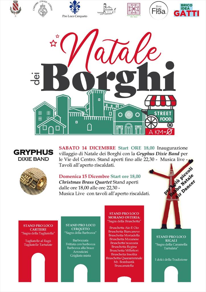 Dopo il grande successo di pubblico ottenuto lo scorso fine settimana per l’inaugurazione del Natale di Christmas time a Gualdo Tadino (tantissimi bambini con le proprie famiglie presenti), Sabato 14 e Domenica 15 Dicembre, presso il centro storico e i Giardini Pubblici (luogo di cui i Gualdesi si devono riappropriare) torna un altro grande week end di eventi per grandi e piccini. Si inizia Sabato 14 in Piazza Martiri della Libertà si svolgerà la “Tombolata” organizzata dall’UNITALSI a partire dalle ore 17,30 con ricchi premi per tutti e tanto divertimento. Si prosegue alle ore 18,00 con la Gryphus Dixie Band, una Band di strada che proporrà per le vie di Gualdo l’intramontabile ritmo del dixie jazz dei primi anni del 900. La Gryphus guiderà i visitatori all’apertura della prima edizione del Natale dei Borghi (Ore 18), ai Giardini pubblici. Un villaggio tipico natalizio allestito dalle Pro loco di Cerqueto, Morano Osteria, Rigali e Cartiere e che proporrà uno street food tutto local e a km sottozero. Tavoli all’aperto riscaldati per godere delle tipicità proposte dalle frazioni del nostro territorio, musica Live e intrattenimento per bambini, il tutto immersi nell’atmosfera dei giardini pubblici illuminati ad hoc per la serata. Natale dei Borghi è organizzato dal Comune di Gualdo Tadino in collaborazione con Pro loco Rigali, Cerqueto, Cartiere e Morano Osteria. Sponsorizzato da Brico Idea Gatti e Birra Flea. Domenica 15 Dicembre invece si prosegue con lo spettacolo Bolle di Sapone Giganti in piazza Martiri della libertà a cura di Arilù animazione e promosso dai commercianti del centro storico dalle ore 16,00. Alle ore 17,30 si svolgerà Natale a 4 Zampe in Piazza Garibaldi, manifestazione organizzata dai commercianti del centro storico, l’ormai celebre appuntamento con il defilè con premiazione dei nostri amici a 4 zampe. Dalle ore 18,00 Christmas Brass Quartet start intrattenimento musicale per le vie del centro e apertura degli stand del Natale dei Borghi ai Giardini Pubblici.