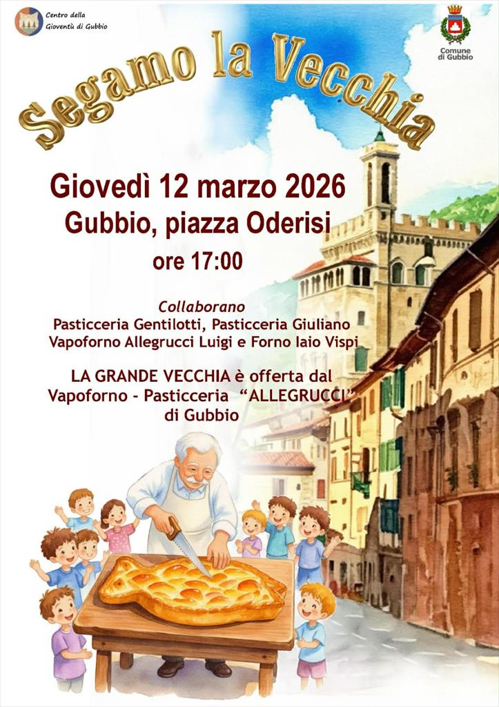 Torna in città la manifestazione "Segamo la Vecchia" organizzata dal Centro della Gioventù con il patrocinio del Comune di Gubbio. L'appuntamento è per giovedì 12 marzo, alle ore 17 in Piazza Oderisi. Si tratta di un'antica tradizione diffusa anche in altre località dell'Umbria legata al periodo quaresimale. "Segare la vecchia” significa sospendere a metà i quaranta giorni di digiuno per concedersi qualche peccato di gola. Collaborano le pasticcerie Gentilotti e Giuliano, il vapoforno Allegrucci Luigi e forno Iaio Vispi. La "Grande Vecchia" è offerta dal Vapoforno - Pasticceria "Allegrucci" di Gubbio.