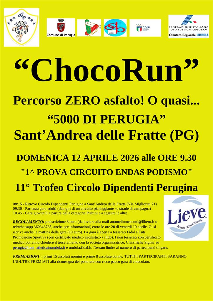Torna domenica 12 aprile l’appuntamento a Sant’Andrea delle Fratte di Perugia con la “ChocoRun”, la tradizionale corsa podistica riservata agli adulti abbinata anche quest’anno al “Trofeo Circolo Dipendenti Perugina” giovanile e valevole quale prima tappa del rilanciato circuito Endas Podismo. La “ChocoRun” si presenterà quest’anno nella stessa versione rinnovata la passata edizione, visto nel rispetto delle sue origini come il “5000 di Perugia”, si disputerà ancora sulla distanza di circa 5 chilometri, ma su un tracciato su strade di campagna e lanciando lo slogan “zero asfalto… o quasi”, ovvero con il 95% di percorso su strade bianche e di terra (solo la linea di partenza e quella di l’arrivo saranno su asfalto. La gara, che gode del sostegno della Nestlè Perugina per i premi a tutti i partecipanti, si svolgerà con inizio alle 09.30 circa, ovvero dopo prima dell’inizio delle gare dei bambini. La manifestazione di Sant'Andrea delle Fratte gode del patrocinio del Comune di Perugia, oltre che della stessa Fidal, del Coni e dell'Endas Umbria. A curare l'organizzazione saranno le squadre dei L’Unatici Ellera Corciano e del Cdp Atletica Perugia, il gruppo giovanile di atletica del Circolo Dipendenti Perugina, che parteciperà ovviamente anche con i propri atleti e che sta crescendo nella propria attività, sotto il coordinamento dei vertici dello stesso Cral aziendale, guidato da Marco Ballerani e Federico Mariangeloni, che da tempo si stanno prodigando per poter garantire anche in questa occasione la miglior accoglienza ai partecipanti. Il ritrovo dei concorrenti sarà presso il Circolo Dipendenti Perugina di Sant’Andrea delle Fratte (Via Migliorati, 21) con il successivo inizio delle gare riservate ai bambini fissato per le 10.45 con i Pulcini e a seguire tutte le altre, sia maschili e femminili. Le distanze andranno dai 100 metri per i più piccoli, passando poi alle tre categorie degli Esordienti, ai Ragazzi, ai Cadetti, agli Allievi e agli adulti. Previsti tanti premi e riconoscimenti per tutti a base di cioccolato e prodotti dolciari. La manifestazione coordinata da Anna Maria Falchetti (per informazioni si può contattare il numero 360343785) è aperta a tutti i tesserati Fidal, ma anche degli altri enti di promozione sportiva riconosciuti (con possibilità anche di chiedere il tesseramento in preiscrizione)