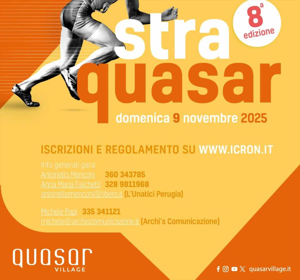 Torna il prossimo domenica 9 novembre la Straquasar, la gara podistica in programma nel territorio corcianese con partenza ed arrivo al Quasar Village. Si correrà una delle classiche degli ultimi anni del podismo umbro in un percorso che attraverserà una parte del paese di Solomeo, lungo un tracciato che sarà all’incirca di 10 chilometri e mezzo. La competizione sarà alla sua ottava edizione, partendo alle ore 10 dallo stesso centro commerciale, da dove sarà anche lo Walking Quasar (8 km), una camminata autogestita che ricalcherà solo in parte il percorso competitivo attraversando le campagne e che si affiancherà alla tradizionale passeggiata (3,5 km) aperta alle scuole. La scelta degli organizzatori dello scorso anno di proporre un nuovo tracciato è stata dettata dalla volontà di renderlo più agevole ed anche più caratteristico, mantenendo al tempo stesso il giusto impatto naturale con il territorio, attraversando la campagna lungo un percorso inibito al traffico automobilistico. La gara sarà ancora organizzata dal Quasar Village insieme alle società dei l'Unatici Ellera Corciano, presieduta da Anna Maria Falchetti, e Cdp Atletica Perugia (la squadra del Circolo Dipendenti Perugina) con il fondamentale apporto dell'Archi's Comunicazione, che si propongono ancora di far vivere una giornata di sport nel territorio all'insegna della corsa e dello sport. Sotto l'egida della Fidal Umbria e dell'Endas, a collaborare ci sono anche l'associazione L'Unanuova ed ovviamente la locale Amministrazione Comunale e la Protezione Civile per garantire la massima sicurezza lungo il tracciato. La gara podistica è aperta agli atleti tesserati Fidal, Runcard ed Enti di Promozione Sportiva (riconosciuti dal CONI) o comunque in possesso della certificazione medica agonistica in corso di validità (tesserandosi con una delle società organizzatrici). Le preiscrizioni sono in corso all'indirizzo www.icron.it (informazioni possono essere richieste al numero 360343785). E' garantita l’assegnazione di un pacco gara a tutti i partecipanti alla gara, mentre saranno premiati i primi tre assoluti uomini e donne e i primi cinque di ognuno delle 13 categorie previste con “Gift Card” liberamente spendibili presso le attività commerciali del Quasar che hanno scelto di dare la propria disponibilità. Premi anche alle prime tre società e sarà riproposto il premio alla memoria di Eros Bastianini, che aveva partecipato alle prime cinque edizioni della competizione ed a lui è infatti è stato deciso di intitolare il premio (in collaborazione con Euronics) destinato ai “senatori” della manifestazione, ovvero a coloro che che hanno preso parte a tutte le edizioni.