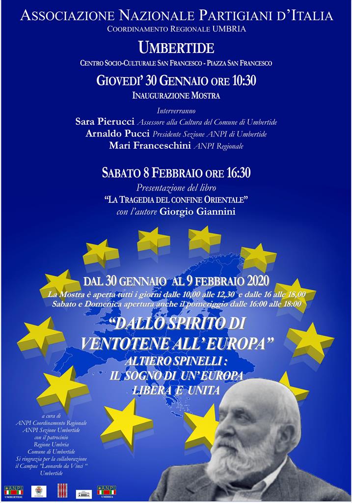 Sarà ospitata presso il Centro socio-culturale San Francesco dal 30 gennaio al 9 febbraio la mostra “Dallo spirito di Ventotene all'Europa. Altiero Spinelli il sogno di una Europa libera e unita”. L'iniziativa, organizzata dall'Associazione nazionale Partigiani d'Italia (ANPI) provinciale di Perugia, dall'ANPI Umbria e della sezione di Umbertide, con la collaborazione del Museo diffuso della Resistenza di Torino, della scrittrice Camilla Poesio e dell'autore Mauro Remondini, è patrocinata dalla Regione Umbria e dal Comune di Umbertide. Anche quest'anno il Campus “Leonardo da Vinci” di Umbertide, ha dato l’adesione al progetto, per una partecipazione e collaborazione attiva all’iniziativa. Come evidenziano gli organizzatori, la mostra rappresenta un’opportunità educativa, sia per la rilevanza dell’esposizione che per il progetto didattico ad essa collegato. All’inaugurazione dell'esposizione, che si terrà giovedì 30 gennaio alle 10.30, parteciperanno l’assessore alla Cultura del Comune di Umbertide Sara Pierucci, il presidente della sezione ANPI di Umbertide, Arnaldo Pucci, e la presidente dell’ANPI provinciale, Mari Franceschini. La mostra sarà visitabile tutti i giorni presso il Centro San Francesco dalle ore 10.00 alle ore 12.30 e dalle ore 16.00 alle 18.00. Inoltre, sabato 8 febbraio sarà presentato alle 16.30 il libro “La tragedia del confine orientale” alla presenza dell'autore Giorgio Giannini.