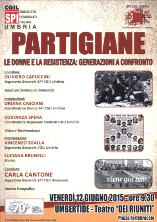 Venerdì 12 giugno, dalle ore 9.30, a Umbertide, presso il “Teatro dei Riuniti” in piazza Fortebraccio si terrà l’iniziativa pubblica “Partigiane. Le donne e la Resistenza: generazioni a confronto”, organizzata dallo Spi Cgil dell’Umbria e dal Coordinamento donne dello Spi Cgil Umbria in occasione del 70esimo anniversario della Resistenza e della Liberazione dal nazifascismo. All’iniziativa, coordinata da Oliviero Capuccini, segretario generale dello Spi Cgil dell’Umbria, interverranno: il sindaco di Umbertide, Marco Locchi, Oriana Casciani, Coordinatrice donne Spi Cgil Umbria, Costanza Spera, coordinatrice regionale Udu Umbria, Vincenzo Sgalla, segretario generale Cgil Umbria, Luciana Brunelli, storica. Concluderà i lavori Carla Cantone, segretaria generale Spi Cgil nazionale. Nel corso dell’iniziativa saranno proiettate anche alcune testimonianze video sulla Resistenza al femminile in Umbria.