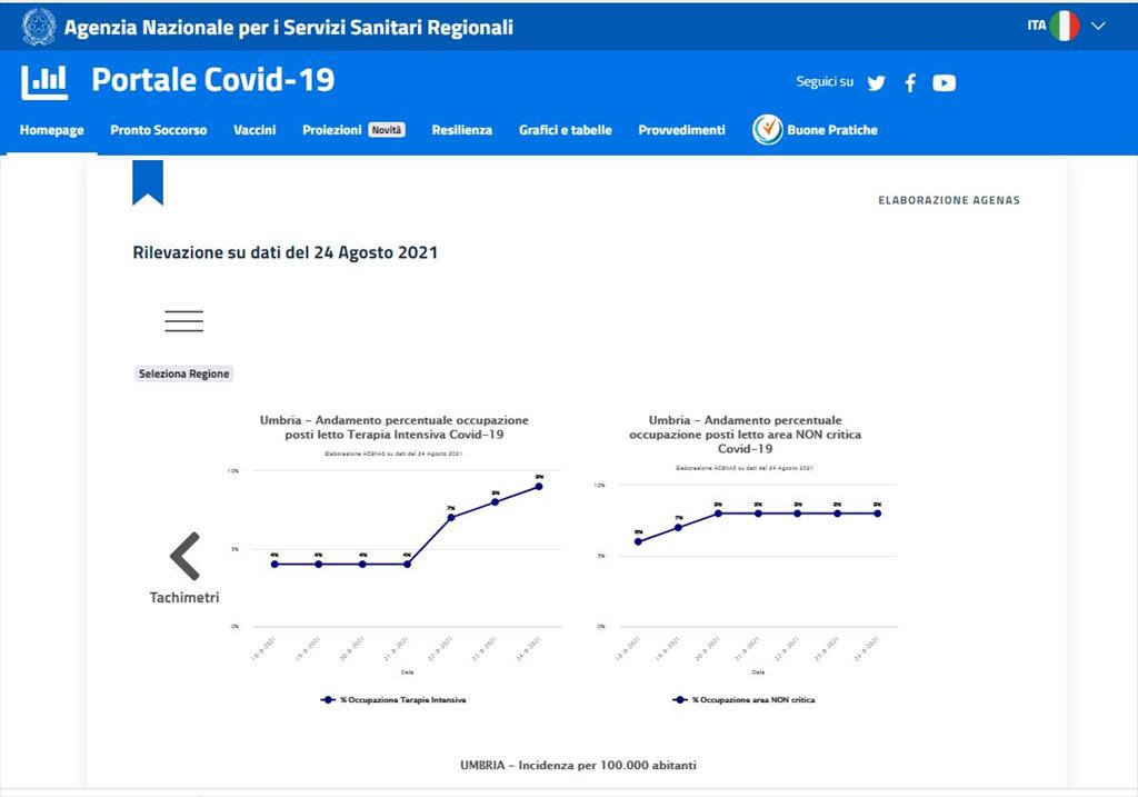 Un anno fa esatto in Umbria per la giornata del 25 agosto si contavano 200 positivi al covid in tutta la regione. I pazienti ricoverati erano 13, di cui uno in terapia intensiva. I decessi erano 80. Un anno dopo, ovvero oggi, il sito della Regione conta 1834 attualmente positivi, 129 nuovi casi, 214 guariti e 62 pazienti ospedalizzati, di cui 8 in terapia intensiva. La variante Delta, con la sua carica virale più elevata, sta lasciando il segno in Umbria, dove la scorsa settimana, secondo il report del nucleo epidemiologico regionale era in netta prevalenza per il 97% dei casi sui tamponi molecolari analizzati. Il dato che tuttavia comincia a destare preoccupazione è quello dell'occupazione dei posti letto in ospedale, che secondo l'ultimo aggiornamento di ieri di Agenas (l'agenzia nazionale per i servizi sanitari regionali) per l'Umbria è pari al 9% per la terapia intensiva. Solo dieci giorni fa era al 2% per la rianimazione, e al 5% per l'area non critica occupata da pazienti affetti da Covid-19, che oggi invece si attesta all'8%. In Italia l'occupazione delle terapie intensive è del 6%. Un tasso che rischia di far cambiare colorazione alla regione, dal momento che per i nuovi parametri governativi, si passa in zona gialla se si supera la soglia del 10% per le terapie intensive e del 15% per le ospedalizzazioni. Il trend umbro non dimostra cenni di discesa, al più di stabilizzazione degli ospedalizzati. Il dato sarà approfondito domani in sede del consueto appuntamento settimanale con il nucleo epidemiologico.