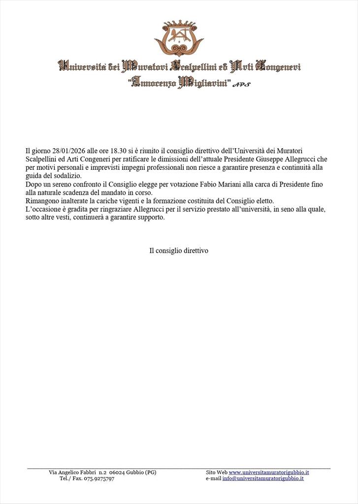 "Motivi personali e imprevisti impegni professionali che non consentono di garantire presenza e continuità alla guida del sodalizio". Sono le motivazioni che hanno portato alle dimissioni di Giuseppe Allegrucci, dalla carica di presidente dell'Università dei Muratori. E' quanto riferito in una nota del nuovo consiglio direttivo che ha ratificato la decisione assunta da Allegrucci. Nel documento si legge che, nella serata odierna, dopo "un sereno confronto" è stato eletto Fabio Mariani "alla carica di presidente fino alla naturale scadenza del mandato in corso. Rimangono inalterate le cariche vigenti e la formazione costituita del consiglio eletto", ovvero: Giorgio Vispi, Mauro Tognoloni, Luigino Bei, Fabio Mariani, Vittorio Pelicci, Giuliano Baldelli, Fabrizio Monacelli, Luca Grilli, Fausto Marionni, Marco Grassini, Gabriele Capannelli, Maurizio Monacelli, Luca Alunno e Francesco Rossi. Consiglio che sottolinea il ringraziamento al presidente Allegrucci per "il servizio prestato all'università, in seno alla quale, sotto altre vesti, continuerà a garantire supporto". Allegrucci ricopriva il ruolo di presidente del sodalizio dopo l'elezione del consiglio direttivo del 2021, subentrando a Fabio Mariani dopo 9 anni di mandato.